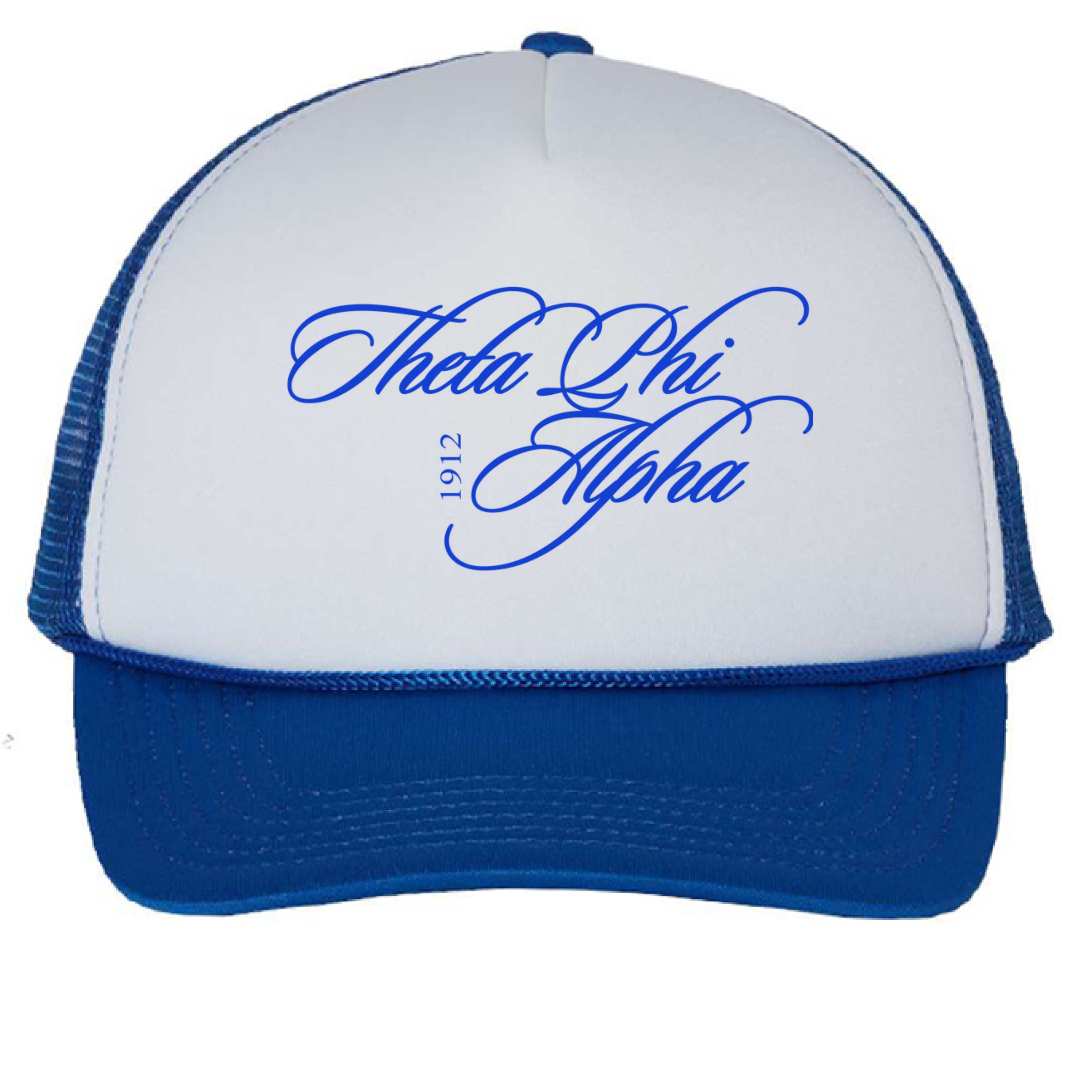 Cursive Theta Phi Alpha Blue Trucker Hat