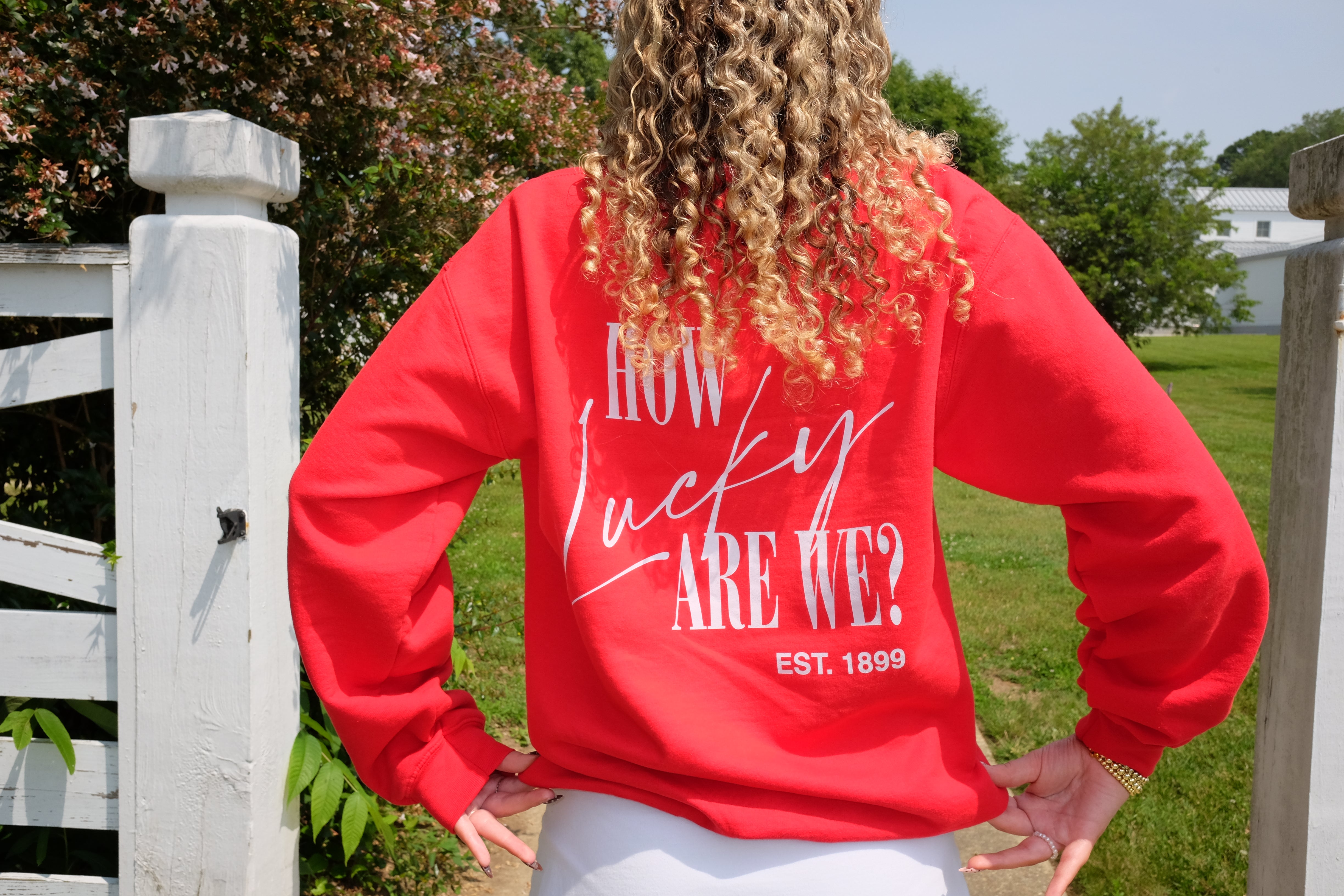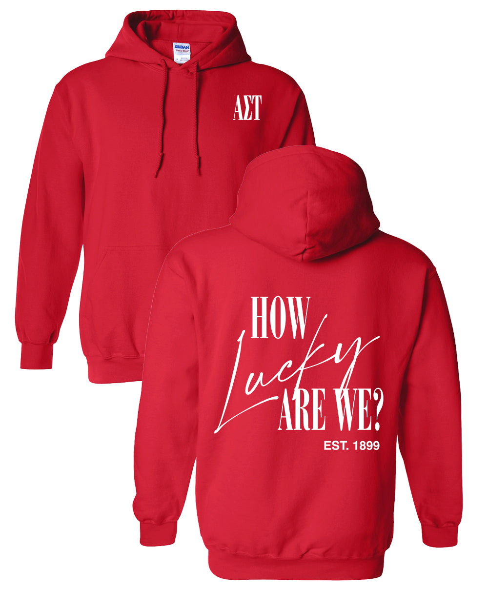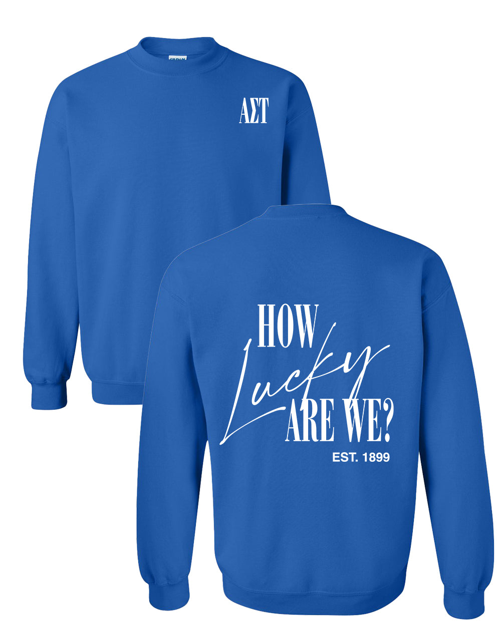 Stay cozy and stylish with our "How Lucky Are We" sweatshirt! Featuring a cute design that shows off just how lucky you are to be an Alpha Tau, this sweatshirt is perfect for lounging or running errands. Get yours today and show off your sorority pride! (Just don't forget to thank your lucky stars!)